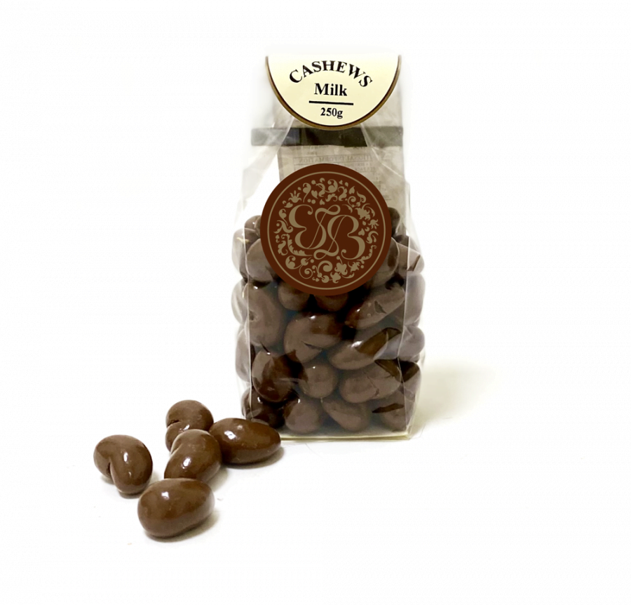 Slow-roasted Australian cashews, gently tumbled in a stream of milk or dark chocolate, presented in a clear grab bag.