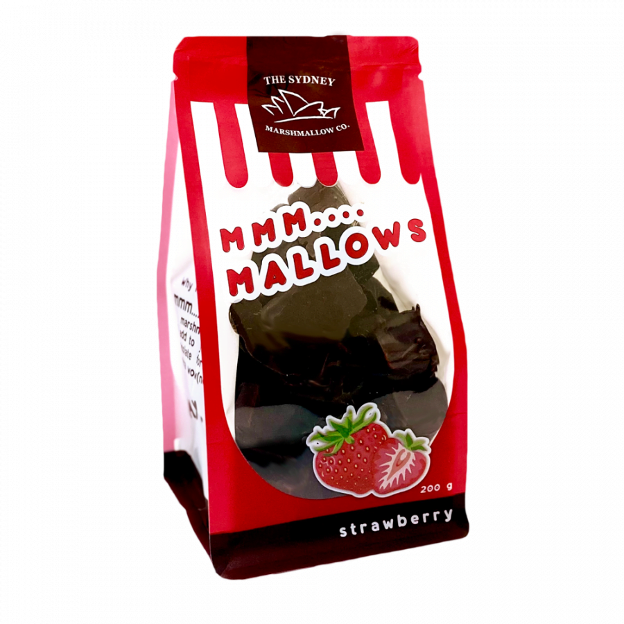 Soft, delicate strawberry marshmallows, coated in dark chocolate.