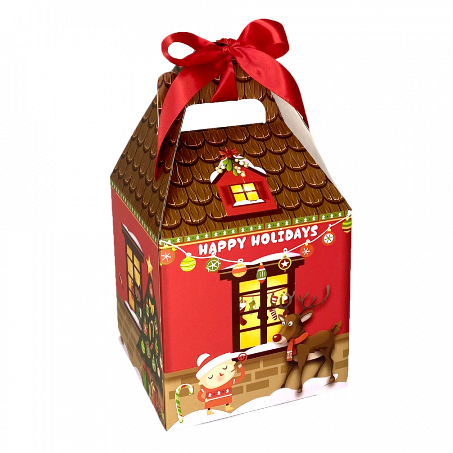 Christmas House box, containing: 1x Candy grab bag 200g , 1x Chocolate Coated Fruits/Nuts 250g, 1x Nougat Half log, 1x Marshmallow 200g, 1x Chocolate Bar, 3x Twisted Top Chocolates, 2x Chocolate Domes, 1 x The Factory Magnet.