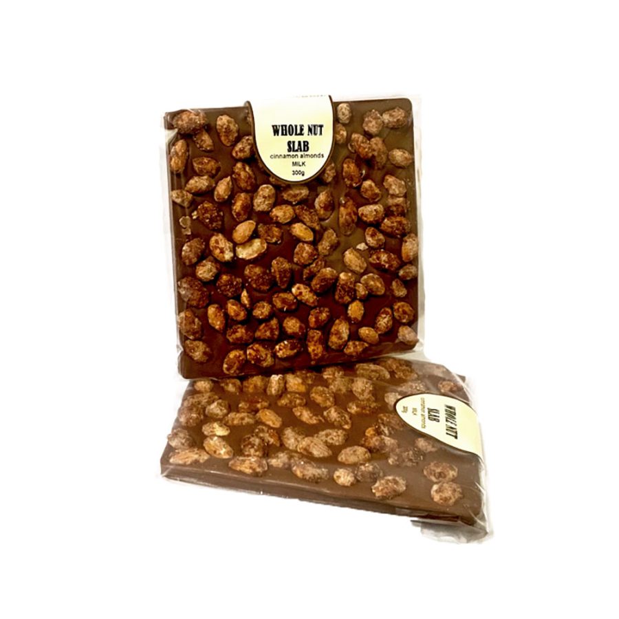 Milk chocolate slab, with cinnamon roasted almonds.