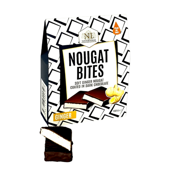 Soft ginger nougat bites, coated in dark chocolate.