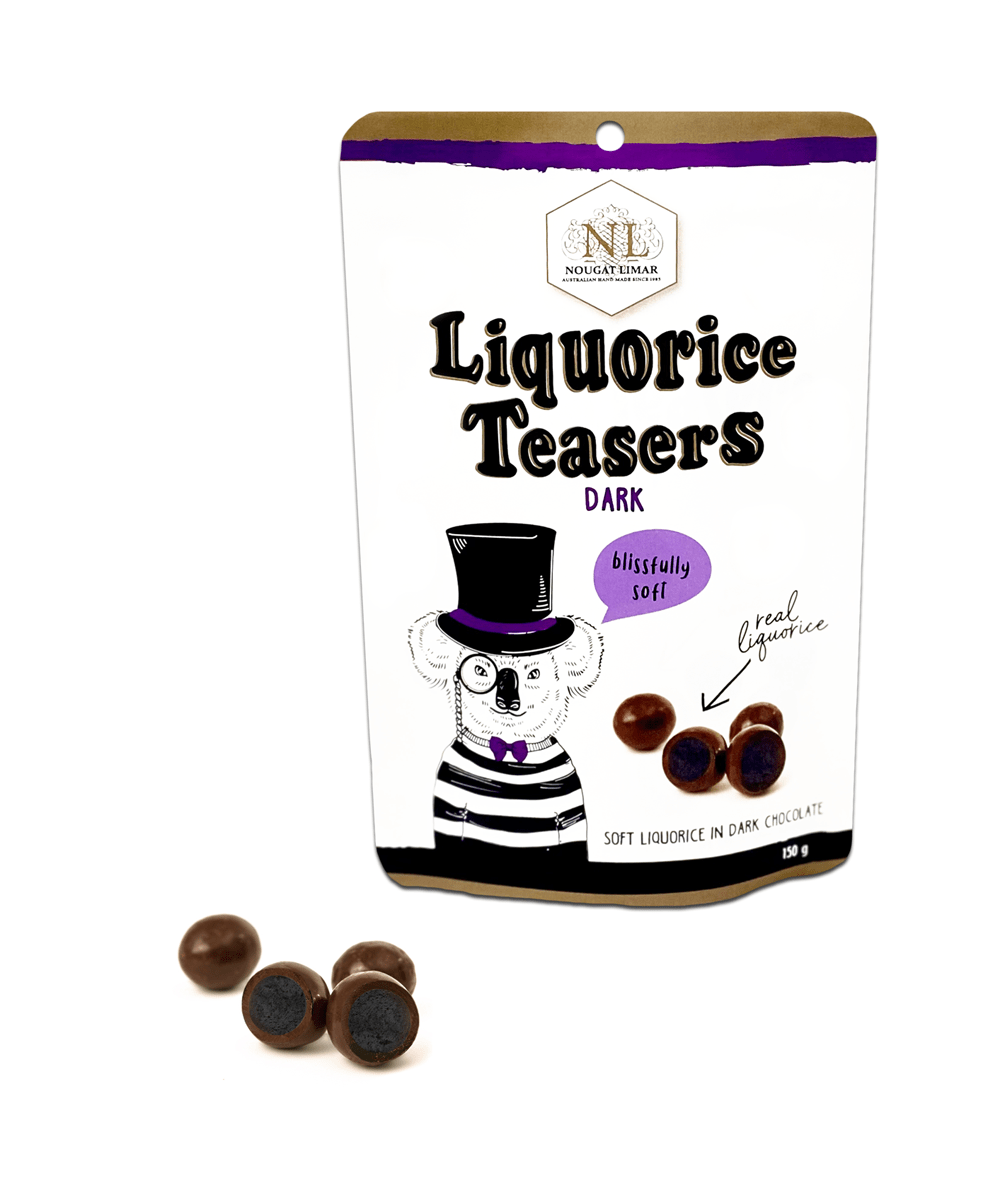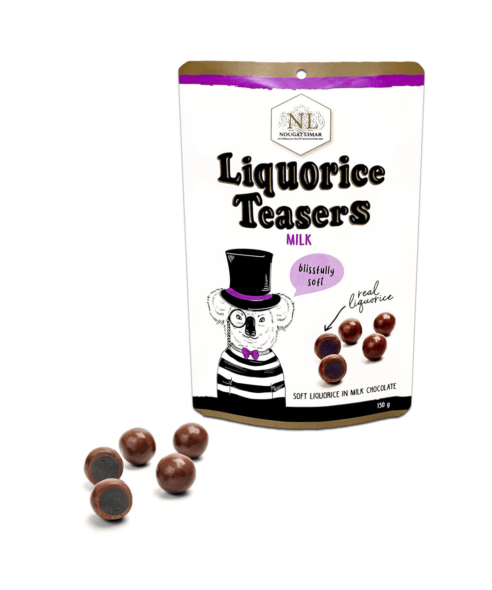 Soft, delicate licorice centers, coated in coated in dark or milk chocolate.
