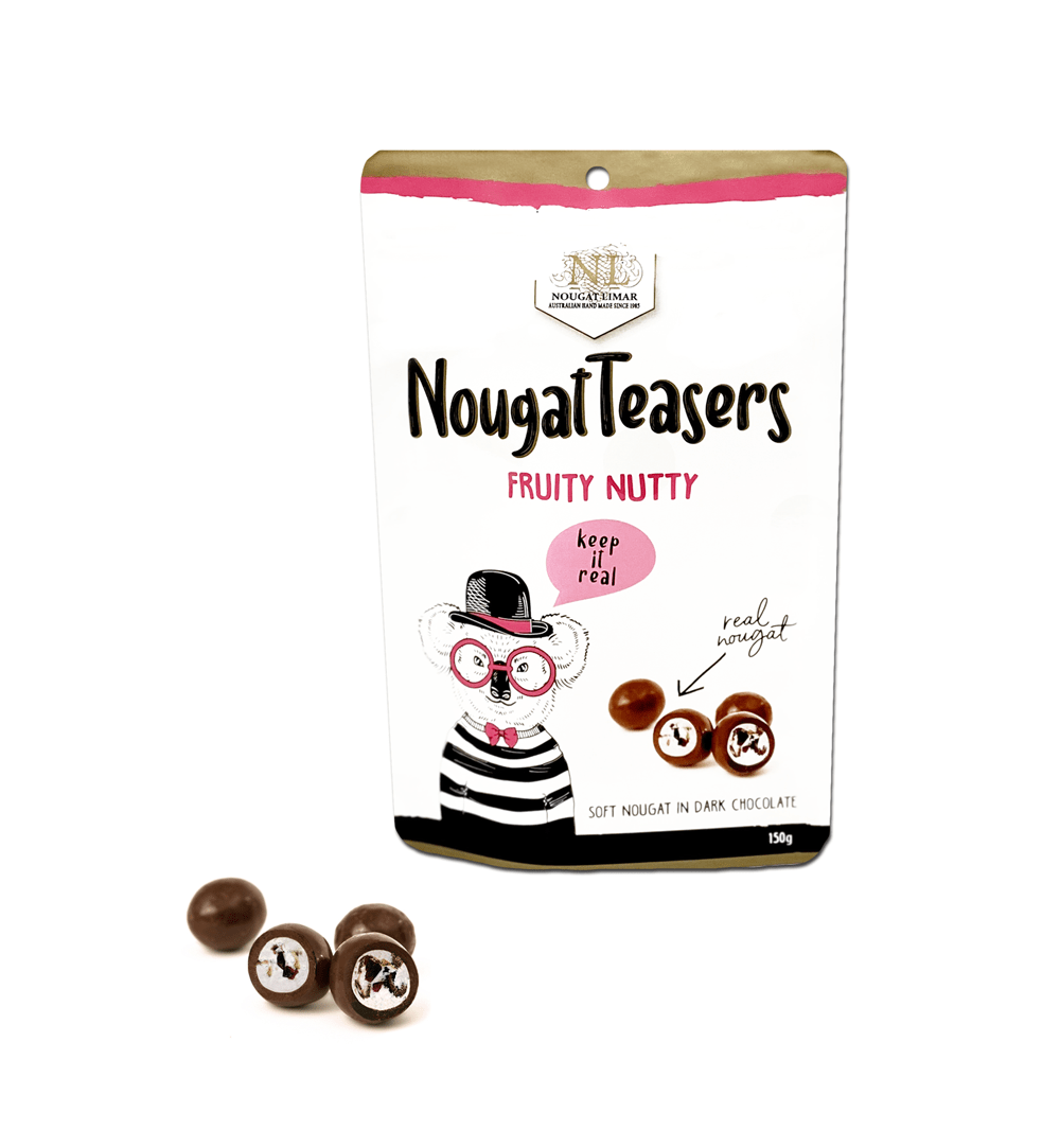 Soft nougat balls, with mixed dried fruits and nuts, coated in dark chocolate.