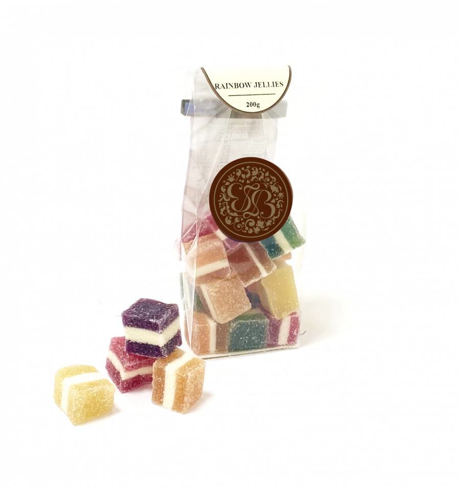 Rainbow coloured jelly squares, presented in a clear grab bag.