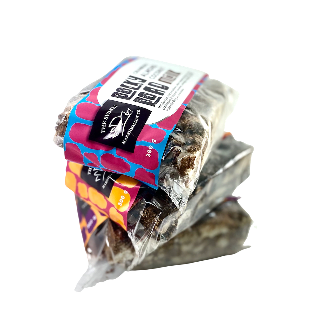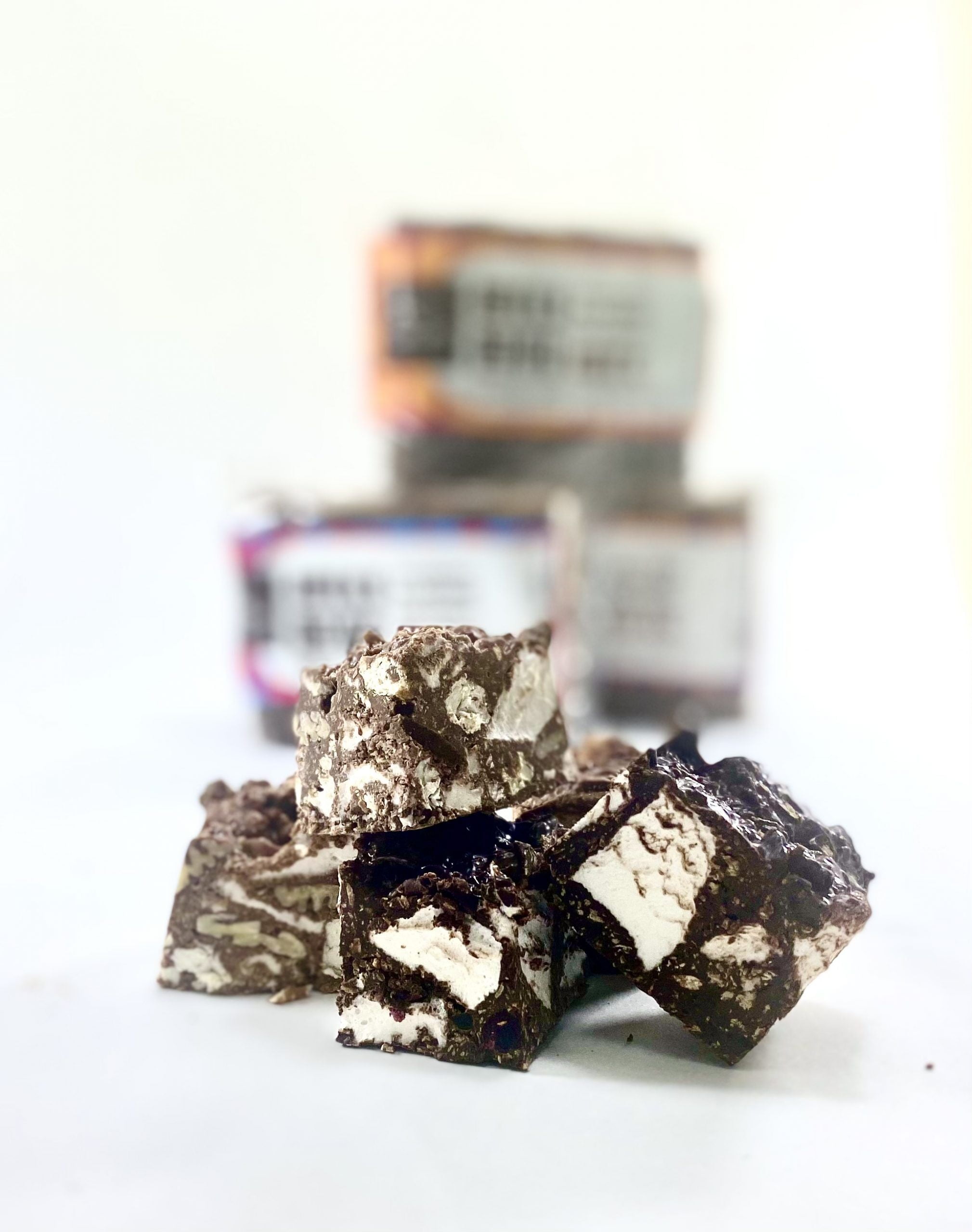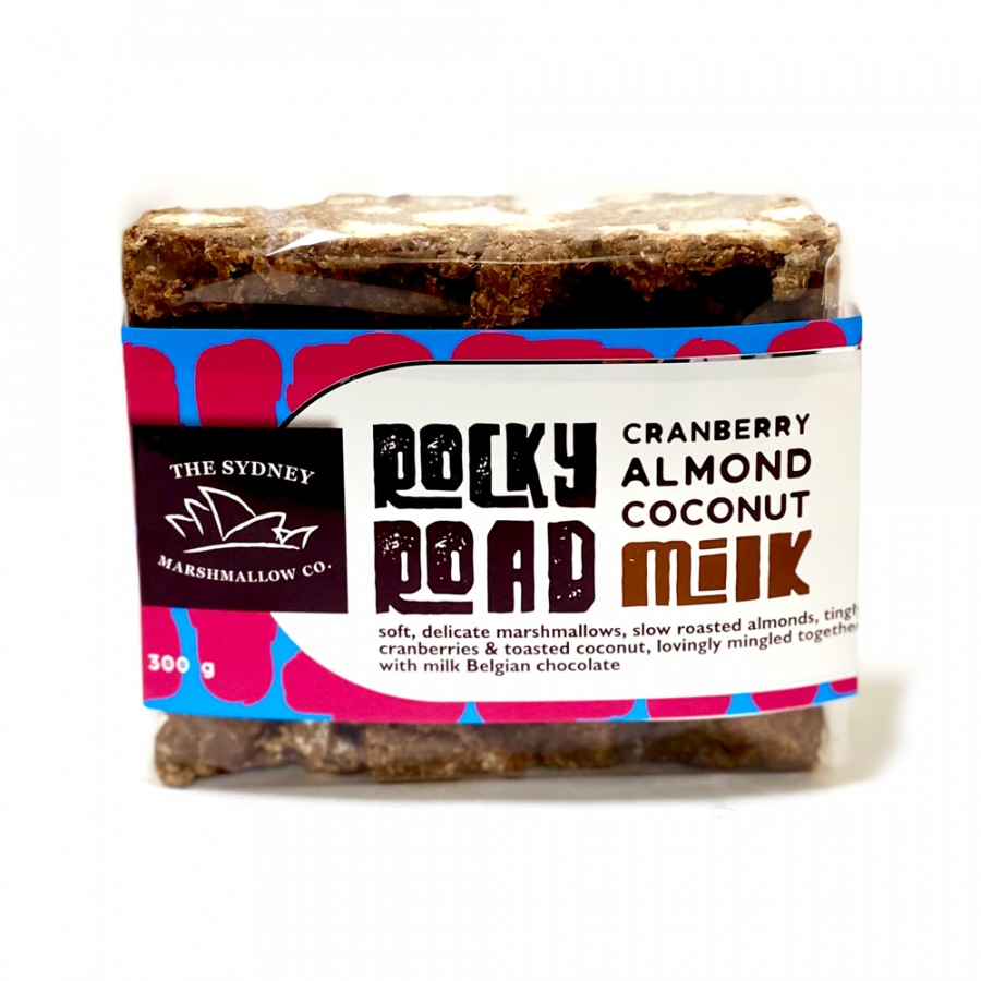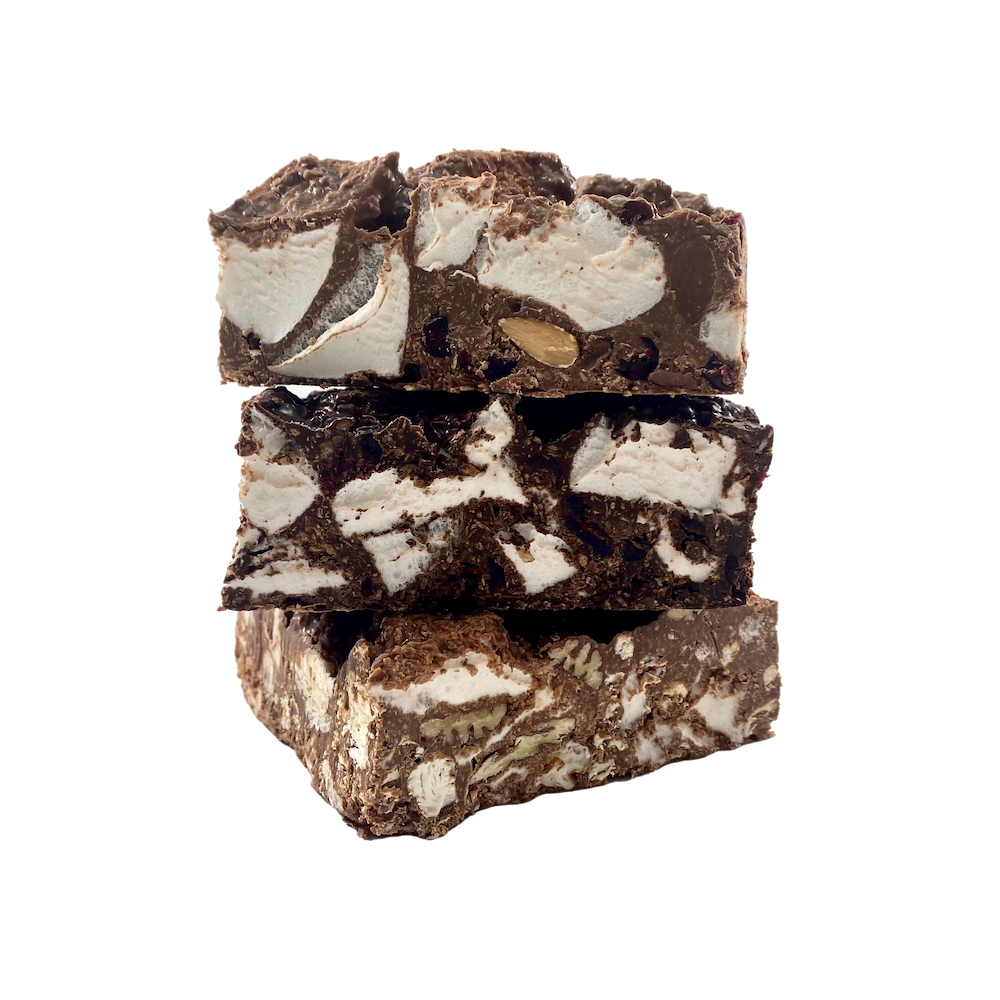 Soft, delicate marshmallows, slow-roasted almonds, tingly cranberries, and crispy coconut, lovingly mingled together with milk or dark Belgian Chocolate.