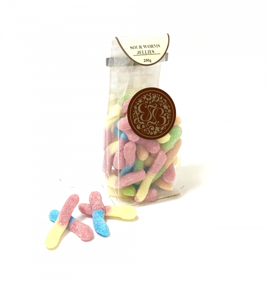 Fruit flavoured gummy worms with a sour coating, presented in a clear grab bag.