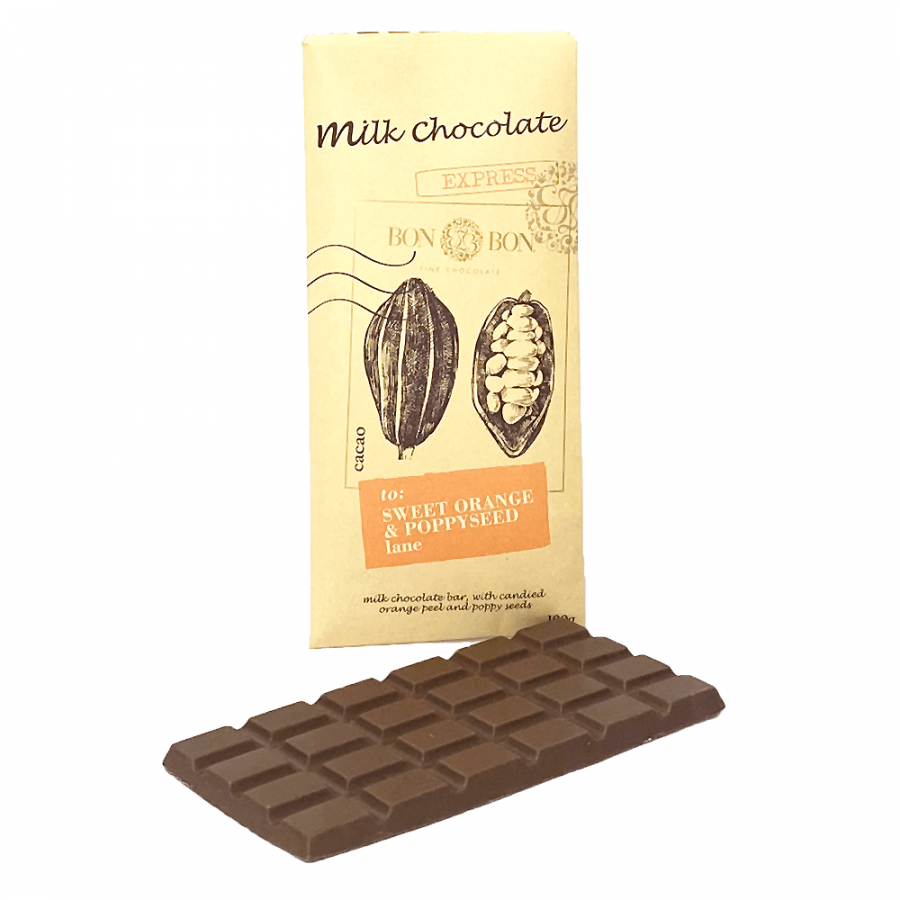 Milk chocolate bar, with candied orange peel and poppy seeds.