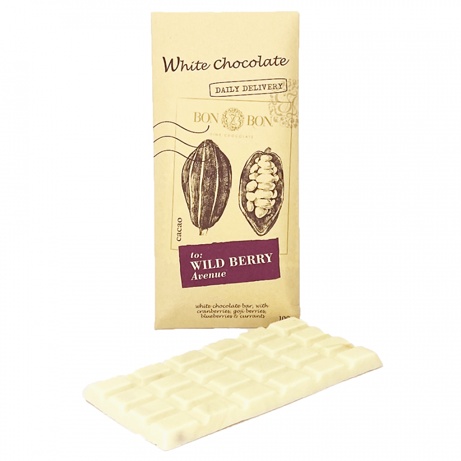 White chocolate bar with dried cranberries, goji berries, blueberries, and currants.